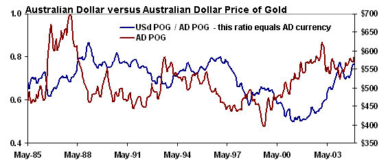 Since then it has recovered to its March 2002 level but has stabilized to just a 3% annual growth rate. Nevertheless, besides the fact that it supports our earlier contention of the relationship between narrow money and gold values, broad money is still growing at 10%, and 3% growth in narrow money is still inflation though maybe not inflation-ary. It is, at any rate, more inflationary than the Fed on average to this day, and moreover, besides the Bank of Japan, the others have been generally more inflationary than the Fed – which is important since it is relative to the US dollar. The ECB has been growing narrow money at a faster annualized rate (7-12 percent) than broad money (5-8 percent) since January 2002. The Bank of England is growing both M1 and M3 at double digit rates and the trend is conspicuously up in both cases – of course, the Pound has been a relatively weak currency and the Sterling price of gold has accordingly been relatively strong recently. These differences are all reflected to some varying degree. But except for the USd, Yen, Swiss Franc, and Pound, most of the other foreign currencies have seen real (gold) gains in their value over the past two years despite the inflation facts – though the Yen should not be in that list if it weren’t for the fact that the BOJ’s deliberate interventions keep it undervalued against the USd (boosting Gold:Yen), and also, Japan has been mulling abandoning its bank deposit guarantees. In any case, generally I want to pin the weaker foreign currency price of gold on the illusory but greater nominal returns offered in those marginal currencies at the moment, and which tend to compete with gold demand in the respective currencies. That’s another way of saying that these currencies have overshot – not necessarily in terms of exchange rates (since the trade data suggests otherwise) but in terms of real (gold) values. The monetary and economic fundamentals argue against a return of the disinflation-ism at any of the central banks let alone the Fed, and the data proffers scant evidence that the gains in real values for the marginal currencies is derived from real monetary restraint or related factors and that it is going to ripple through the currency complex like it did in the nineties. The trade data tells us that the foreign exchange value of the US dollar still has room to fall; the monetary data tells us that all the currencies are overvalued against gold for roughly the same reasons – the competition for domestic gold demand from financial assets that are stoked artificially through inflation policies (rather than really through the productivity miracle for instance). In other words, the resolution to this state of affairs in our analysis is that gold prices begin to rise in foreign currency terms but faster in USd terms, which is basically the same as saying that the real (gold) value of the US dollar will fall faster than the US dollar’s foreign exchange value. It does not infer a bottom in the FX value of the US dollar. The case for a bottom in the foreign exchange value of the US dollar rests on the case for a reversal of the relationship between the foreign currency price of gold and the USd price of gold (POG). That is, when the foreign currency POG begins to rise RELATIVE TO the USd POG – which is the same as saying when either the foreign currency POG begins to rise faster than the USd POG or the USd POG begins to fall faster than the foreign currency POG. In our opinion, this inflection point will be marked by the coming down turn in most stock markets. As a final reflection on our outlook above, recall that the foreign currency price of gold leads (for the relatively marginal currencies): of the divergences between the AD price of gold and the USd price of gold since 1971 where the AD price of gold peaked first there were only two instances where the USd price of gold did NOT follow suit, and where the continued rally in the USd price of gold forced the Australian dollar price of gold higher instead. Both instances occurred during the 1985-87 gold rally – the second best gold leg besides the current one since the seventies. Although the AD price of gold bottomed first in 1985, it peaked twice during that cycle while the USd price of gold continued higher (like today); and both times the AD price of gold ended up breaking out higher. However, the final peak occurred in the AD price of gold first, and not long after its last break out higher. In any case, foreign currency gold price trends are important to monitor as leading indications. Could POG Divergences Be Related