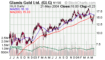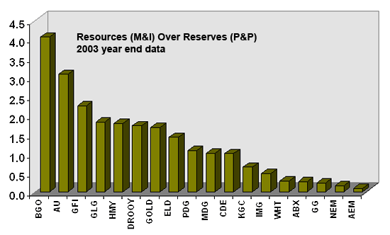 Glamis Gold: Five-Year Plan: "With the growth in reserves and the rapid development of the El Sauzal and Marlin gold projects in Mexico and Guatemala, Glamis expects to exceed its near-term objective of producing 500,000 ounces of gold annually by more than 100,000 ounces and achieve this goal a year ahead of schedule. The Company now anticipates gold production of over 600,000 ounces in 2006 and 700,000 ounces in 2007, at estimated total cash costs well below $150 per ounce" - Feb 6 2004 company news release Bema and Eldorado are cheaper based on current cashflow projections, so they probably have more upside than Glamis in terms of share values; but I view Glamis as a more stable less risky grower. We're buying one of the more expensive ones (based on traditional valuation yardsticks) in a cheap sector! In Glamis' case the market has priced in its growth at current gold prices. But I'm not sure there will be a more timely opportunity to buy it - it's one that investors just might have to pay up for. The market has priced the growth in production at Bema and Eldorado with less conviction. In all three cases, however, where the growth has been priced or nearly priced, the effects of higher gold prices haven't been factored. Although slightly cheaper, both Eldorado and Bema are the more likely candidates for share dilution arising from the future financing of development projects, rather than Glamis who is in a stronger financial position overall. Glamis' current cashflows are expensive; but there is plenty of upside to be realized from tomorrow's gold prices. Another way to look at it is that although its production growth has been factored, unlike others in the sector, the market is only pricing that production at a $400 gold price, and it is not pricing any growth beyond 2007. It's the best growth play in the sector in my view. Best Book & Reserve Value Notwithstanding, I also like buying value on this simple basis, which is why we probably own stocks like Harmony and Gold Fields. Anyhow, leaving Placer Dome out on account that it is one of the larger hedgers (unfortunately because it actually has a terrific portfolio of resource properties), the gold shares that offer the best values in terms of the value of their reserves, current cashflows, and relative to balance sheet statistics (adjusted for asset diversification) are Harmony, Gold Fields, Kinross, and Randgold. Agnico Eagle scores high on reserve value but low when it comes to assessing cashflow multiples and mine diversity. In this category as it depends on a process of elimination I have to rule out Kinross and Randgold as well because their mines have comparatively short lives on one level or another. I don't see much potential for production growth at Kinross in the medium term; though Randgold is expected to almost double production by 2006. I think Randgold is a buy because it is cheap and offers more nearby growth; but Gold Fields and Harmony are the most obvious blue chip value plays in the whole sector (in my index I would have replaced Kinross with Durban Deep if we didn't already own the other two overall cheaper South Africans). Gold Fields produces about 4 million ounces of gold yearly while Harmony produces about 3 million ounces. The former is also about 30% larger in terms of the amount of reserves it controls. I'm not sure we can say Gold Fields has more political clout in South Africa any longer but it has much more attractive growth, performance, and cashflow ratios than Harmony so we have to award it the best ranking for this category of book values. However, we calculate that Harmony might have the best leverage to any step up in the Rand price of gold. Its operating performance has seen the flat end of the hammer for most of the past year due to rising costs and flat Rand gold prices. But this is also the source of its leverage should these factors relent even a bit. In the calculation of NAV and FMV in the tables in this report I include cash holdings per share. However, I also assume fixed costs, which may hold good for a while but not for long if gold is going to $1,000 an ounce. It shouldn't matter much in a relative comparison between two companies producing in the same region as is the case here. Nevertheless, I still expect the Rand price of gold to rise faster than production costs in South Africa en route to the $1,000 target level for US dollar gold prices.