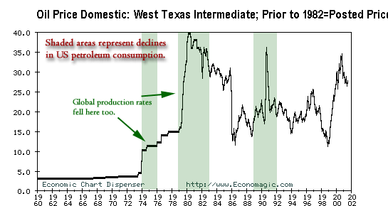 In fact, the 1974/75 "demand" shock followed the peak and subsequent decline in US oil production in 1972, as per the Hubbert model, while the 1979/1983 "demand" shock followed a plateau in M.E. oil production (see chart). While consumption peaked in 1979, the rate of production in those countries plateau'd shortly after the 1974/75 recession. Certainly the recessions helped to soften demand but not nearly as much as the high price of oil did, perhaps. Indeed, consumption of oil began to increase again as soon as prices began their long-term decline in 1982, and did not look back except for the effect on demand that the price shocks of 1990/91 had. Certainly, the EIA has been forecasting slower consumption, but their case would be much stronger if they were basing it on the price shock of 1999/2000 rather than on the perception of slower economic growth resulting from declining stock prices. One of the differences between the outcome of the 1974/75 economic recession, on oil prices, and the outcome of the 1981/83 recession, is that Fed Policy fanned the former price rise, and Fed Policy reined the latter price rise in. Recall that Arthur Burns had the pedal to the metal, trying to pull the economy out of recession, while Paul Volcker's job was to inspire deflation. The subsequent rise in the dollar, already softening economy, and vast malinvestment in the oil business did much more damage to the price of oil than did a declining stock market. Today, as Merrill Lynch's global oils team observes, the industry has just experienced a 19-year contraction. And Hubbert predicts that this contraction can only be offset with higher prices. Bugos predicts, much, much higher prices. The drop in consumption during 1990/91 was the result of a supply shock to production that resulted from the Kuwaiti fires and the seizure of many other wells in the region. What makes us so sure that it wasn't a demand shock? Because the price of oil went to $40. It was a demand shock; only it was caused by price. So having explained the important declines in US oil consumption, let's consider how oil prices respond to declining stock prices. In the summer of 1990, the DJIA traded at 3000 then Iraq invaded Kuwait, and the average fell to just above 2300, nearly a 20% decline. Oil prices did not decline, because they were part of the catalyst for the stock market debacle. Between 1997 and 2000, the Dow fell by more than 10% 4 times, and none of the declines had anything much to do with the oil in the Middle East.